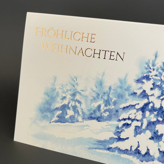 Weihnachtskarte Heißfolie rosé | Verschneiter Winterwald in blau
