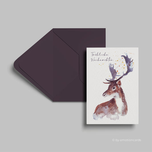 Weihnachtskarte | Hirsch mit Lichterkette, Aquarell künstlerisch