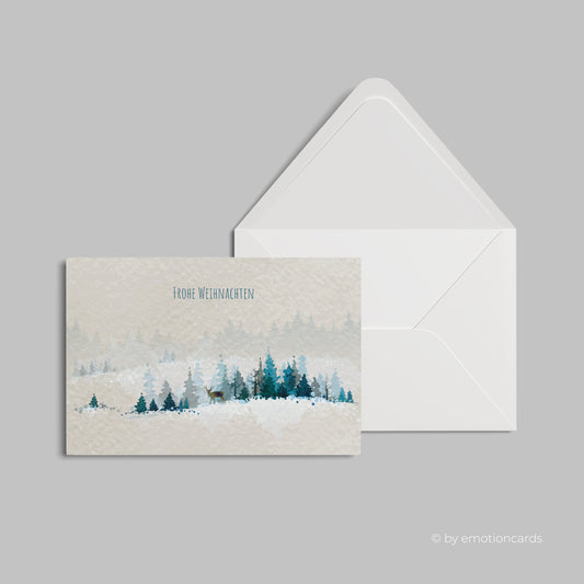 Weihnachtskarte | Aquarell Winterlandschaft mit Hirsch