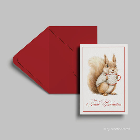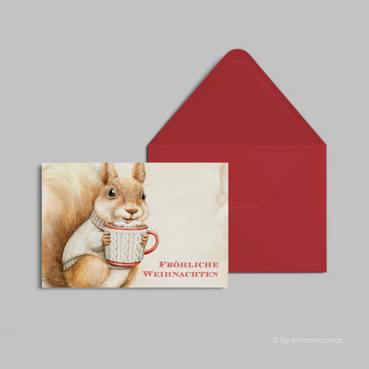 Weihnachtskarte | Süßes Eichhörnchen mit heißer Schokolade