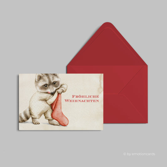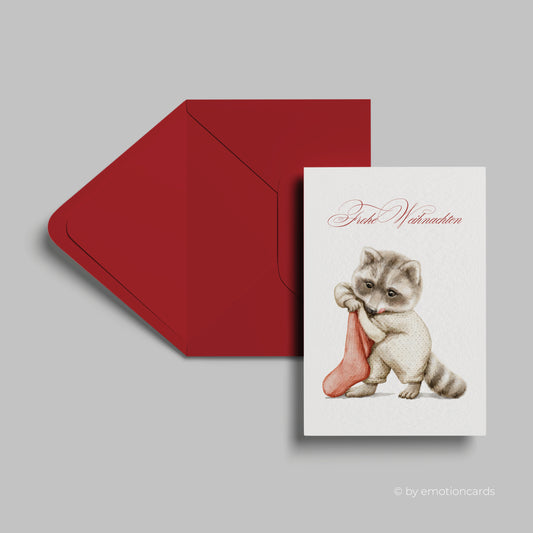 Weihnachtskarte | Süßer Waschbär mit Weihnachtssocke
