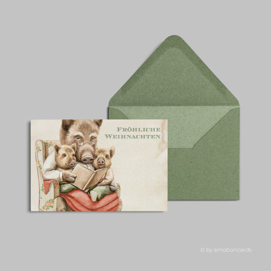 Weihnachtskarte | Wildschweinfamilie liest Weihnachtsgeschichte