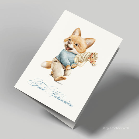 Weihnachtskarte | Süßer kleiner Fuchs mit Steckenpferd