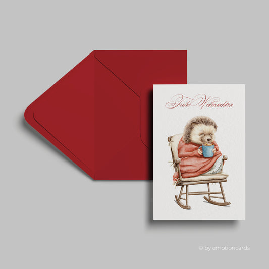 Weihnachtskarte | Igel mit Decke und heißer Schokolade auf Schaukelstuhl