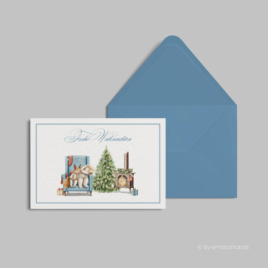 Weihnachtskarte | Schlafende Hasen am Kaminfeuer