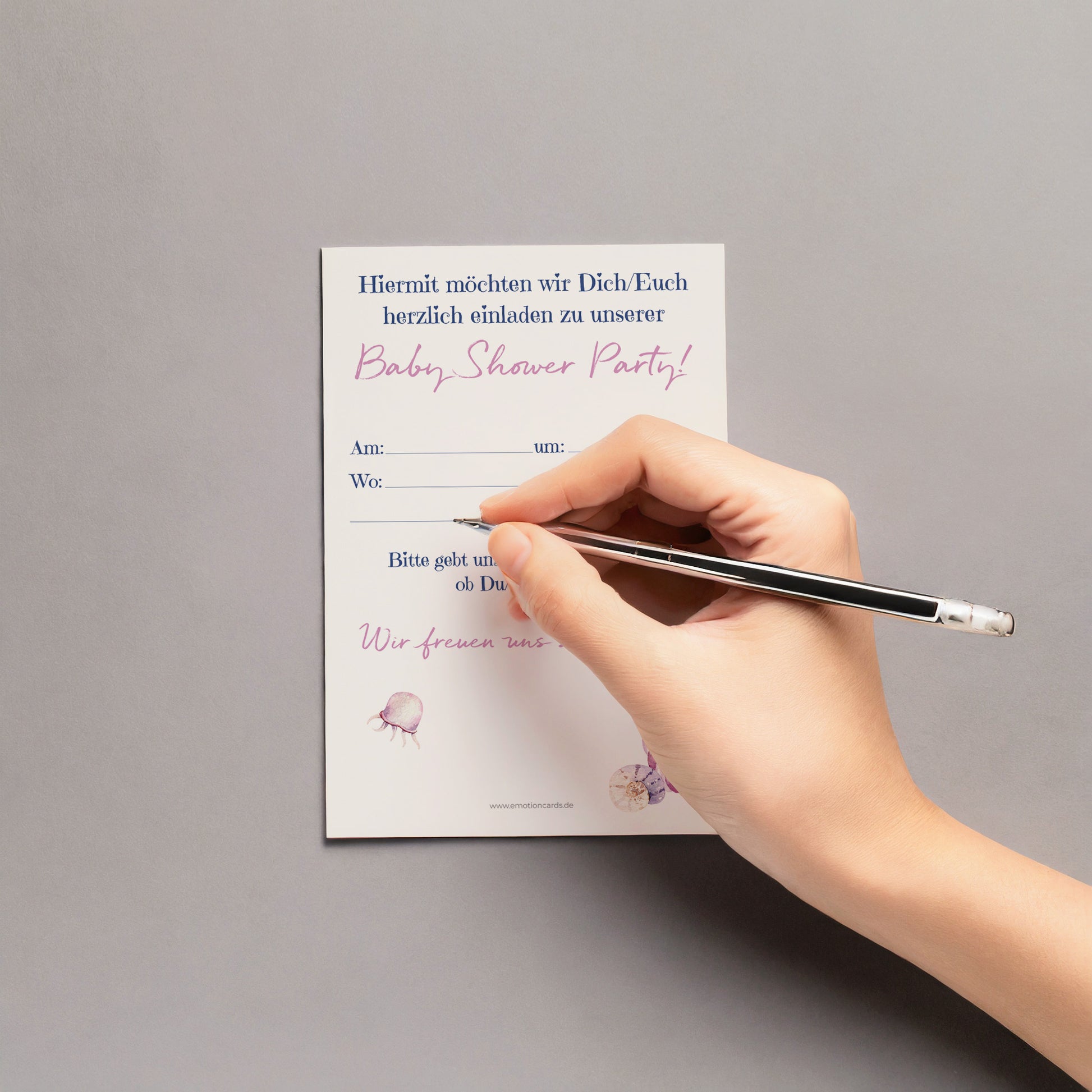 Schöne Einladungskarten zur Baby Shower Party für Mädchen! Aus FSC-zertifiziertem Papier und größer als übliche Postkarten (115mm x 170mm). Wählen Sie optional passende Umschläge aus und beeindrucken Sie Ihre Gäste mit diesen hochwertigen, umweltfreundlichen Karten. Jetzt bestellen und die perfekte Party planen!