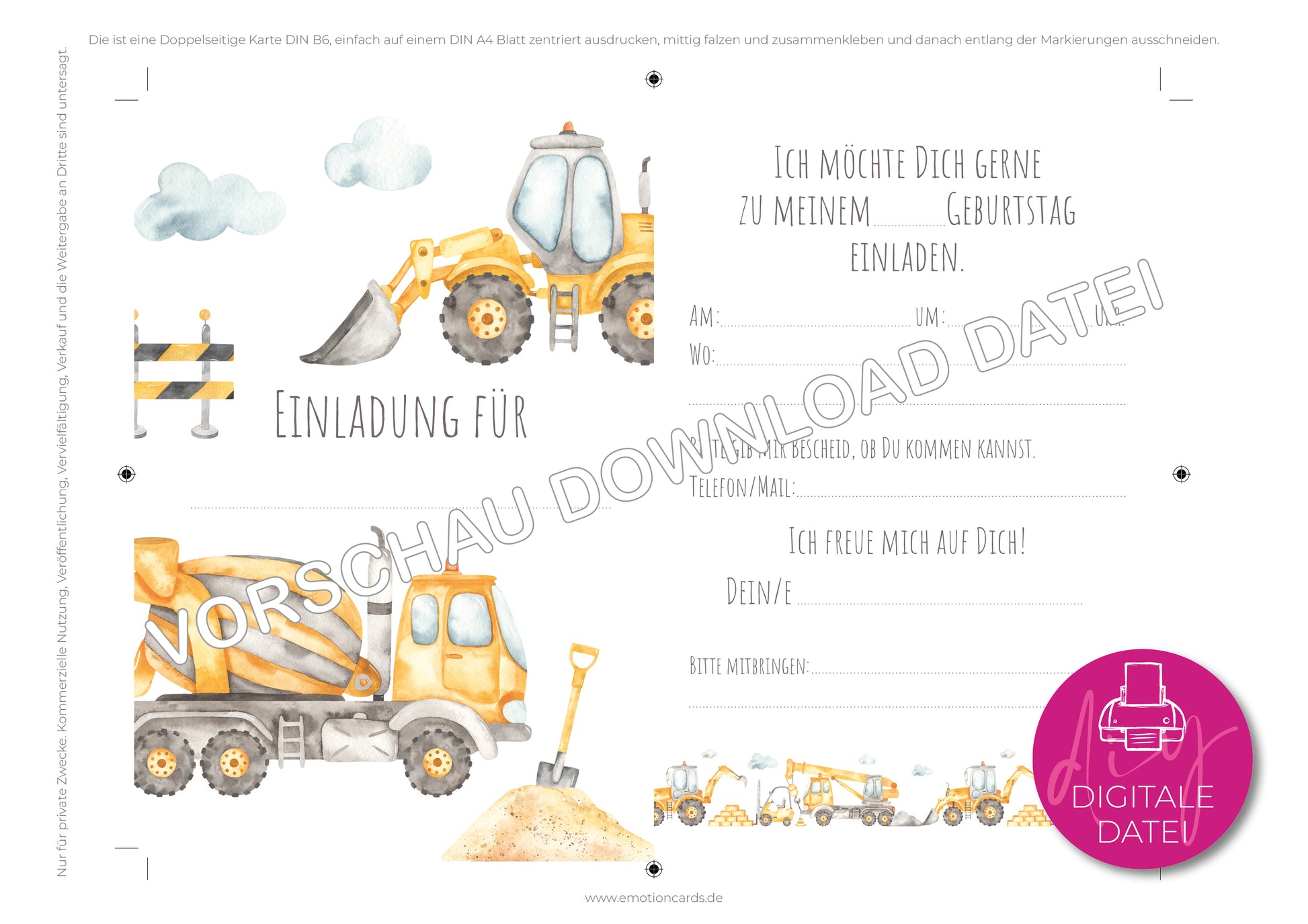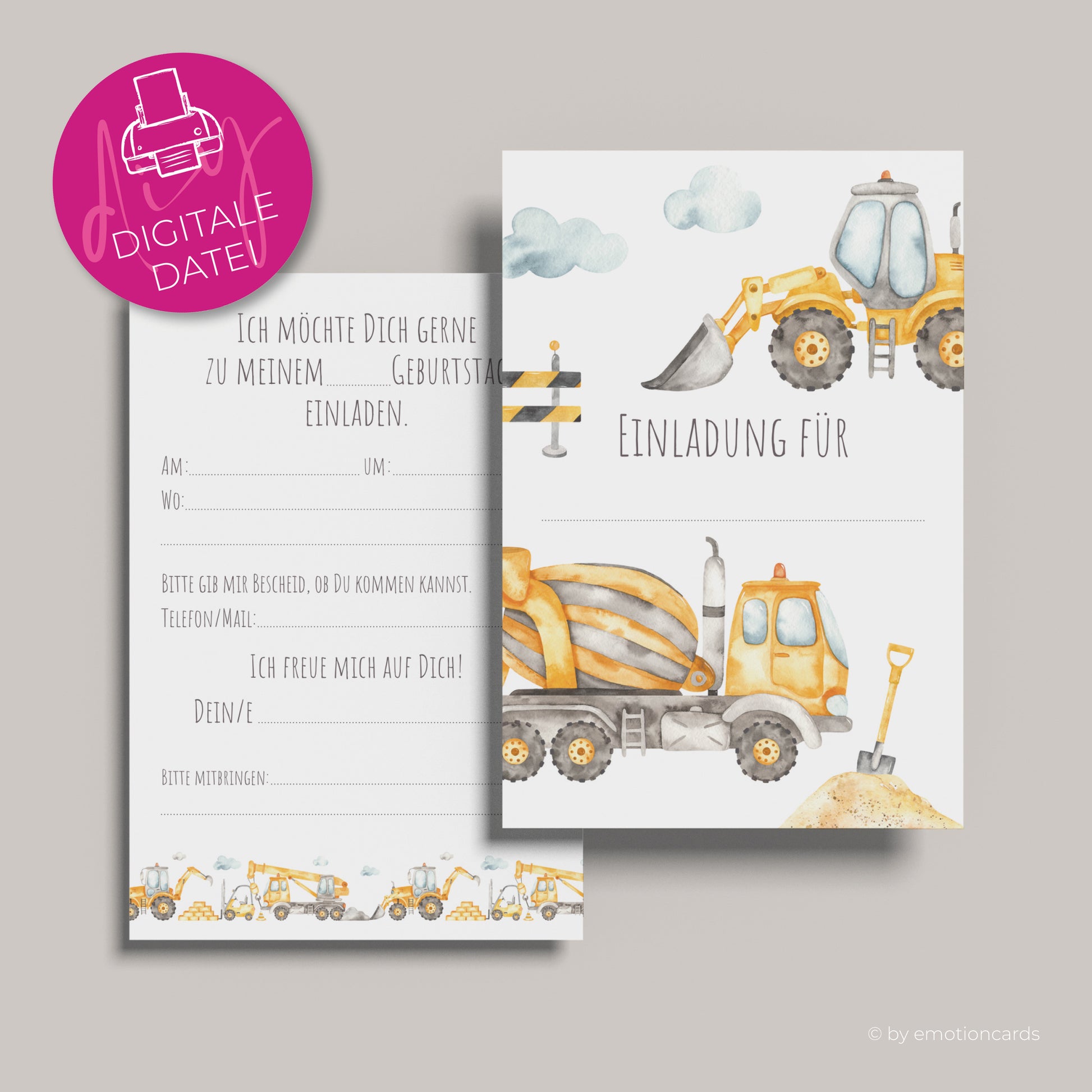 Einladung Kindergeburtstag zum Selbstdrucken | Baggerparty Radlader