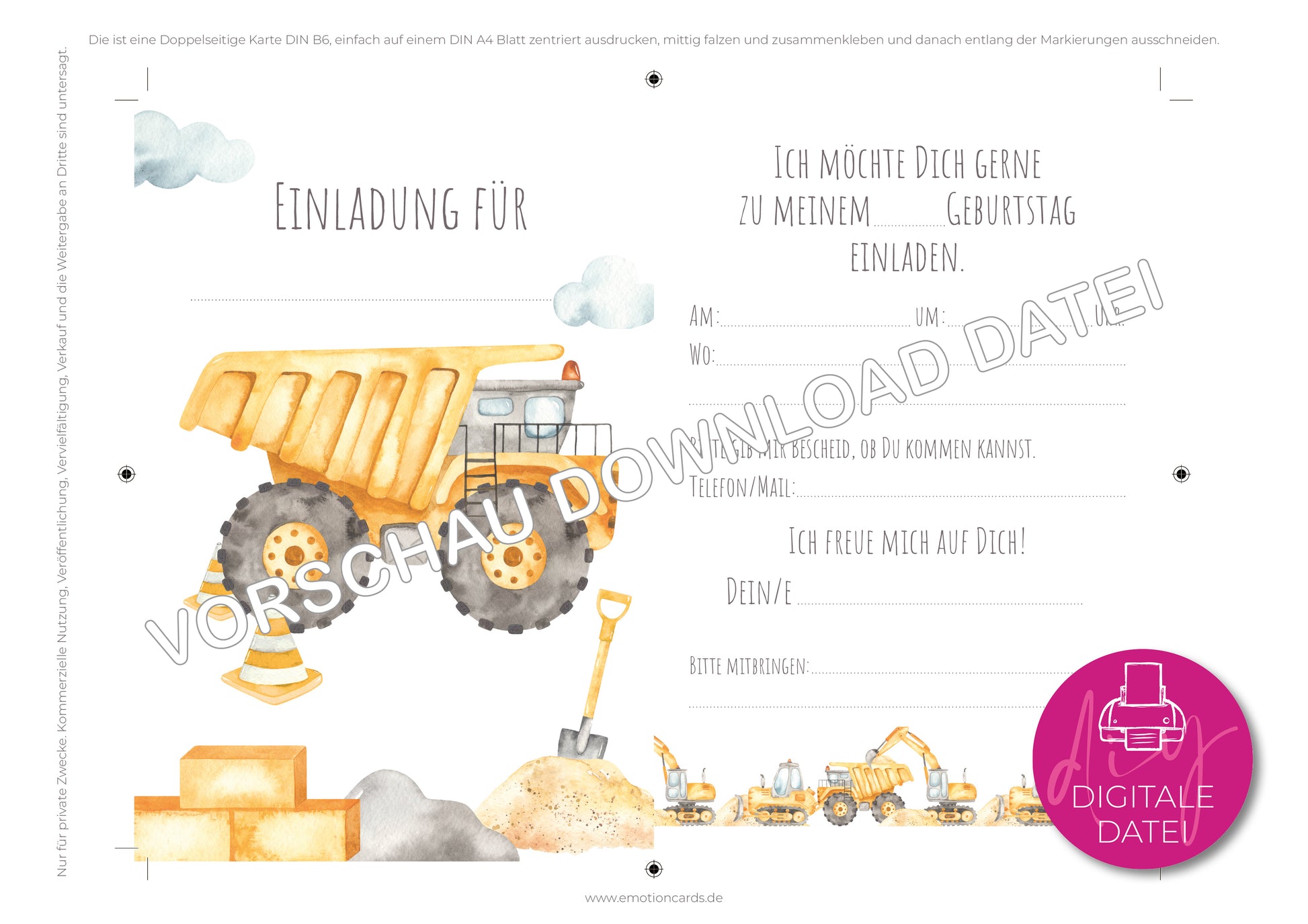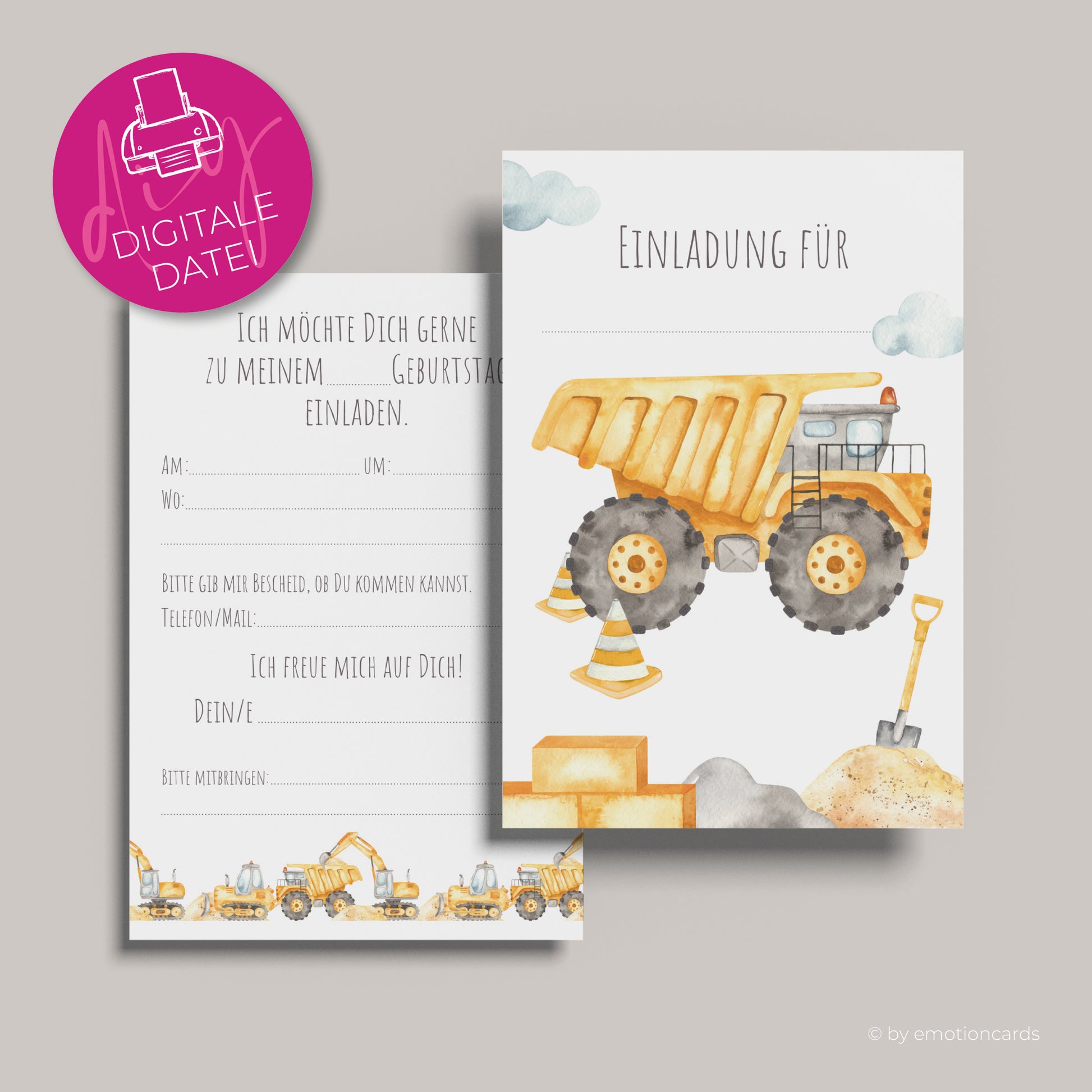 Einladung Kindergeburtstag zum Selbstdrucken | Baggerparty Muldenkipper