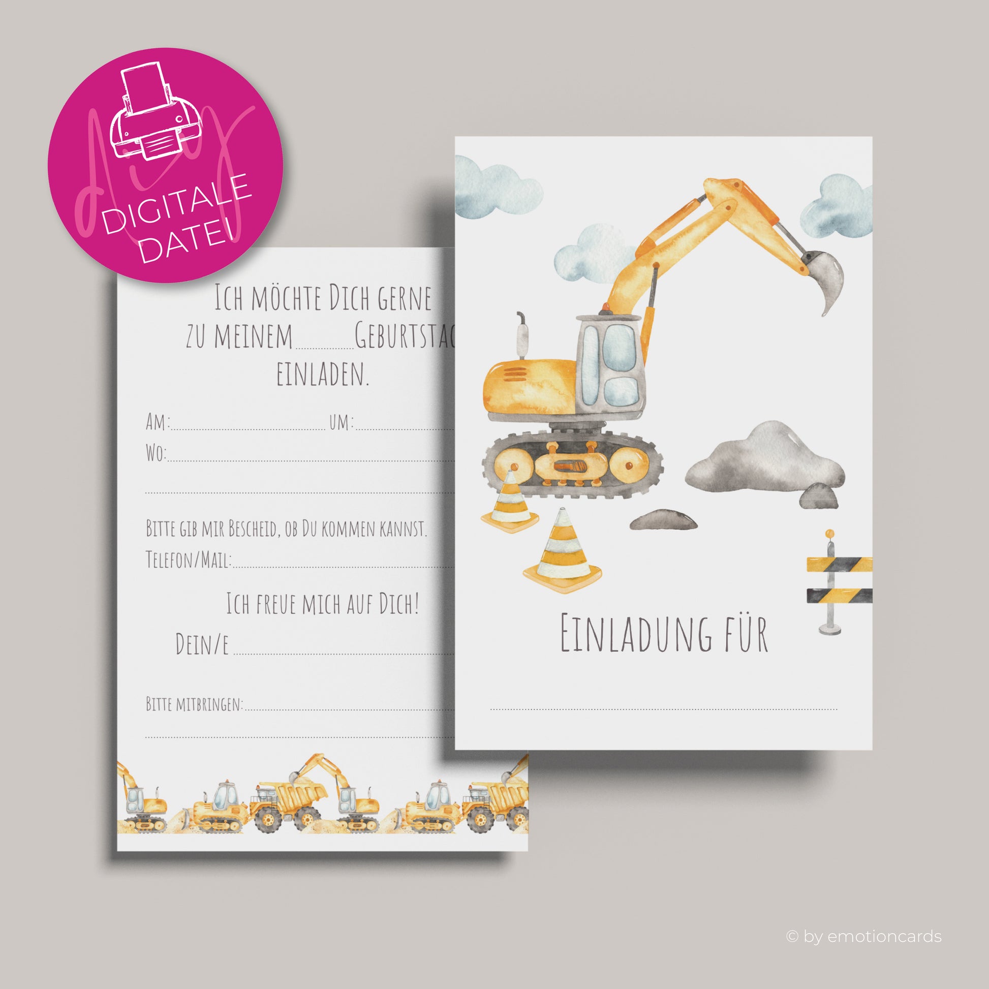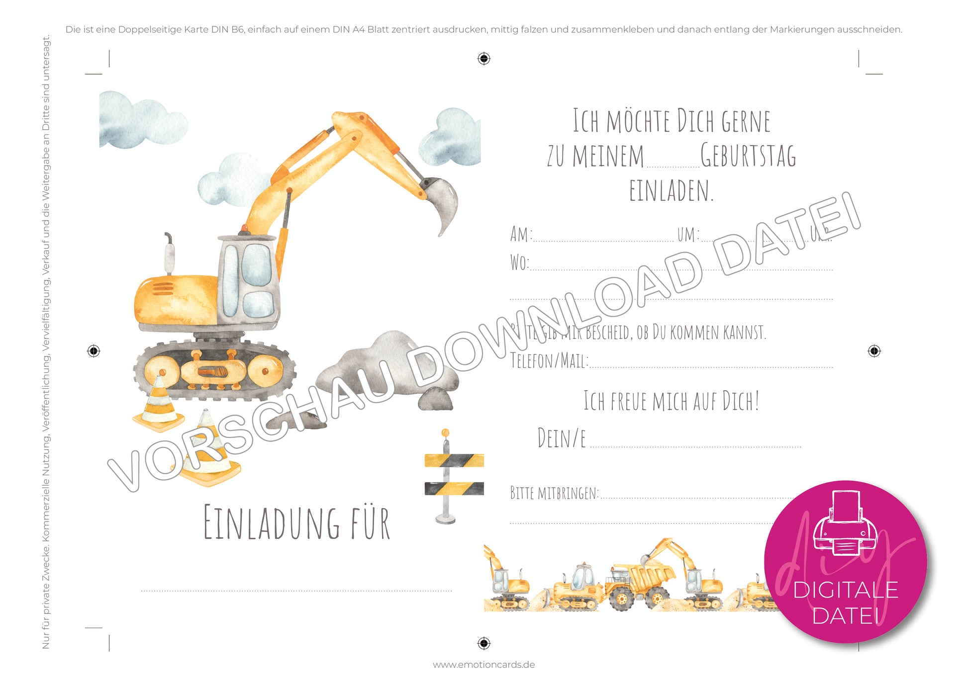 Einladung Kindergeburtstag zum Selbstdrucken | Baggerparty Raupenbagger