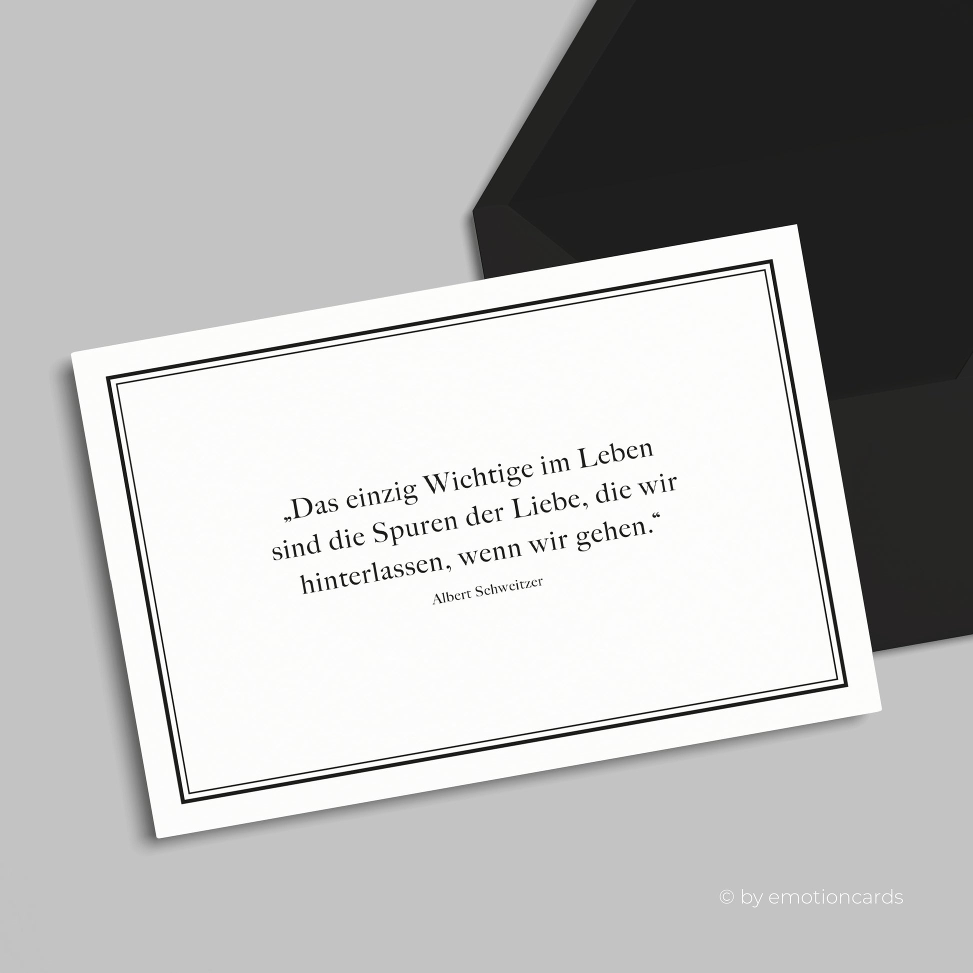 Diese elegante Trauerkarte mit einem schönen emotionalen Zitat von Albert Schweitzer ist eine einfühlsame Art, dein Beileid auszudrücken. Mit stilvollen Rahmen und auf hochwertigem Premium-Karton gedruckt, ist sie eine besondere und persönliche Geste. Inklusive Umschlag und in einer Größe von 170mm x 115mm erhältlich.