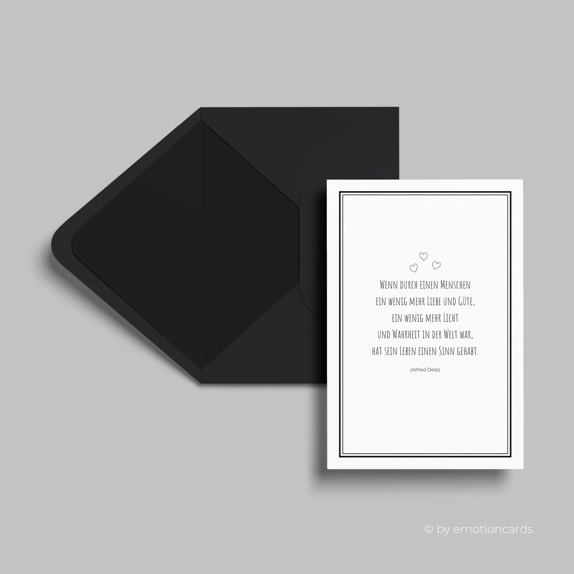 Diese elegante Trauerkarte mit einem schönen emotionalen Zitat aus von Alfred Delp ist eine einfühlsame Art, dein Beileid auszudrücken. Mit stilvollen Rahmen und auf hochwertigem Premium-Karton gedruckt, ist sie eine besondere und persönliche Geste. Inklusive Umschlag und in einer Größe von 115mm x 170mm erhältlich.