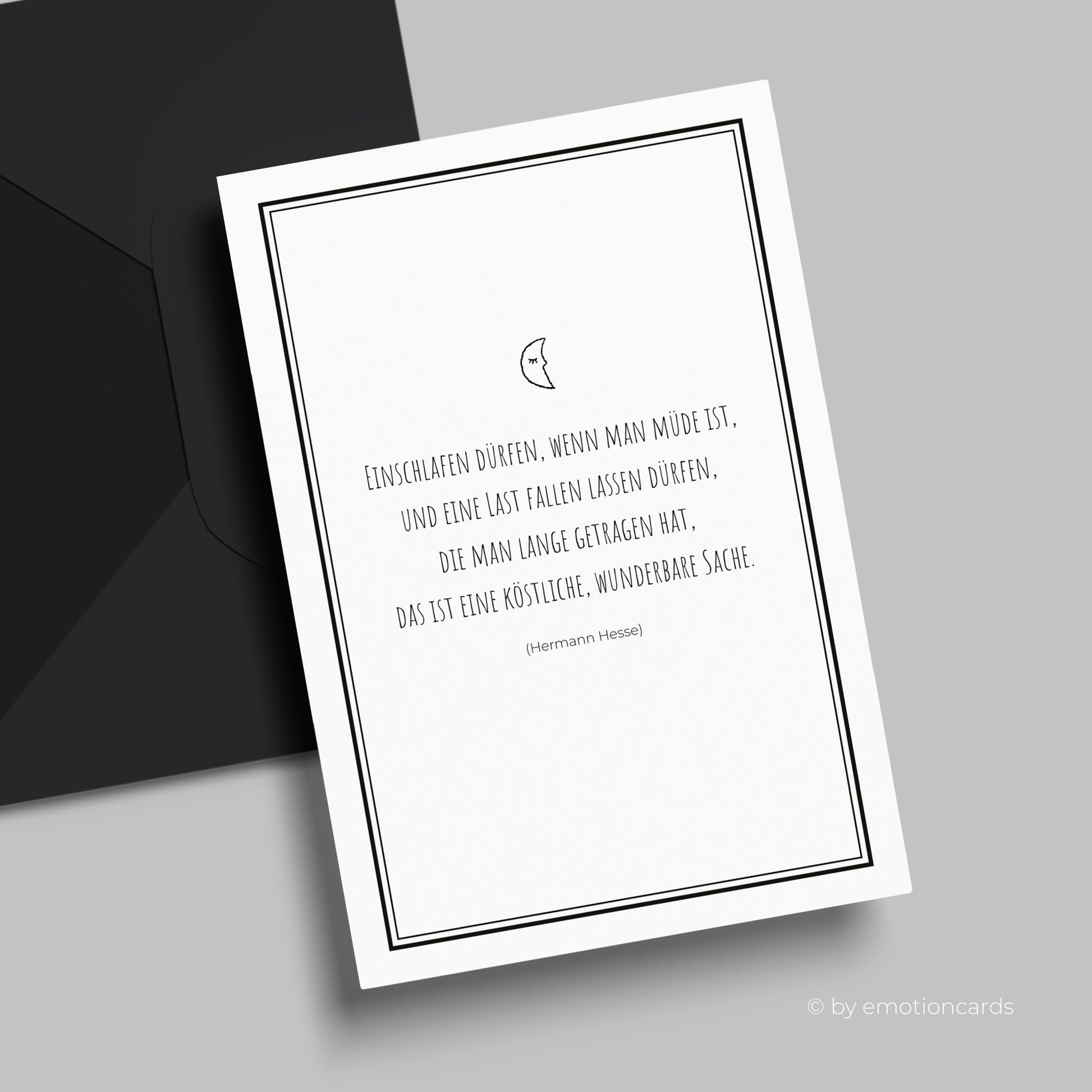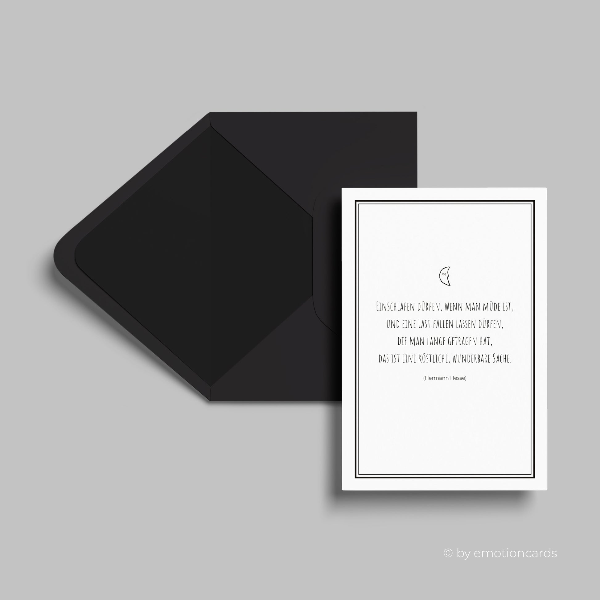 Diese elegante Trauerkarte mit einem schönen emotionalen Zitat von Hermann Hesse ist eine einfühlsame Art, dein Beileid auszudrücken. Mit stilvollen Rahmen und auf hochwertigem Premium-Karton gedruckt, ist sie eine besondere und persönliche Geste. Inklusive Umschlag und in einer Größe von 115mm x 170mm erhältlich.