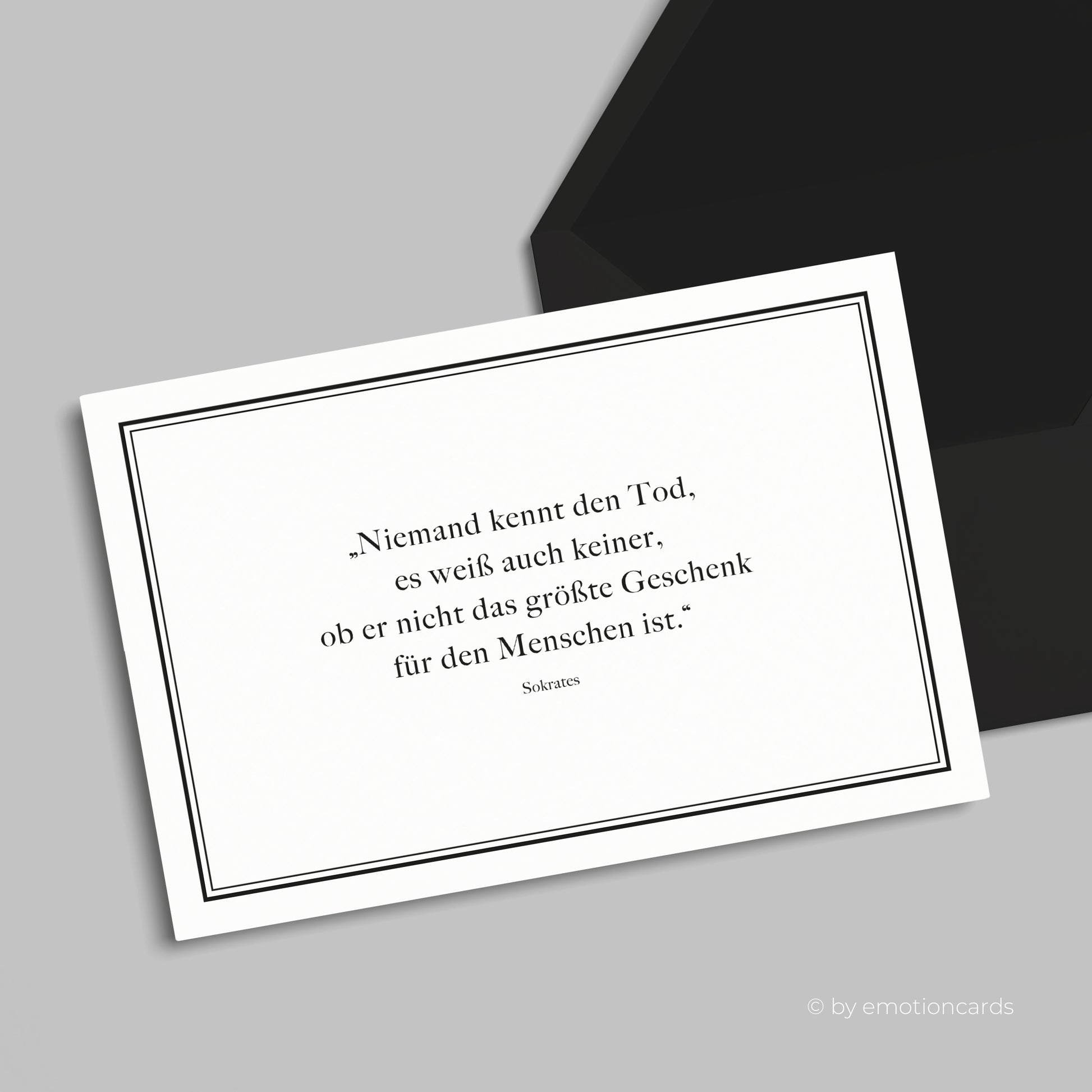 Diese elegante Trauerkarte mit einem schönen emotionalen Zitat von Sokrates ist eine einfühlsame Art, dein Beileid auszudrücken. Mit stilvollen Rahmen und auf hochwertigem Premium-Karton gedruckt, ist sie eine besondere und persönliche Geste. Inklusive Umschlag und in einer Größe von 170mm x 115mm erhältlich.