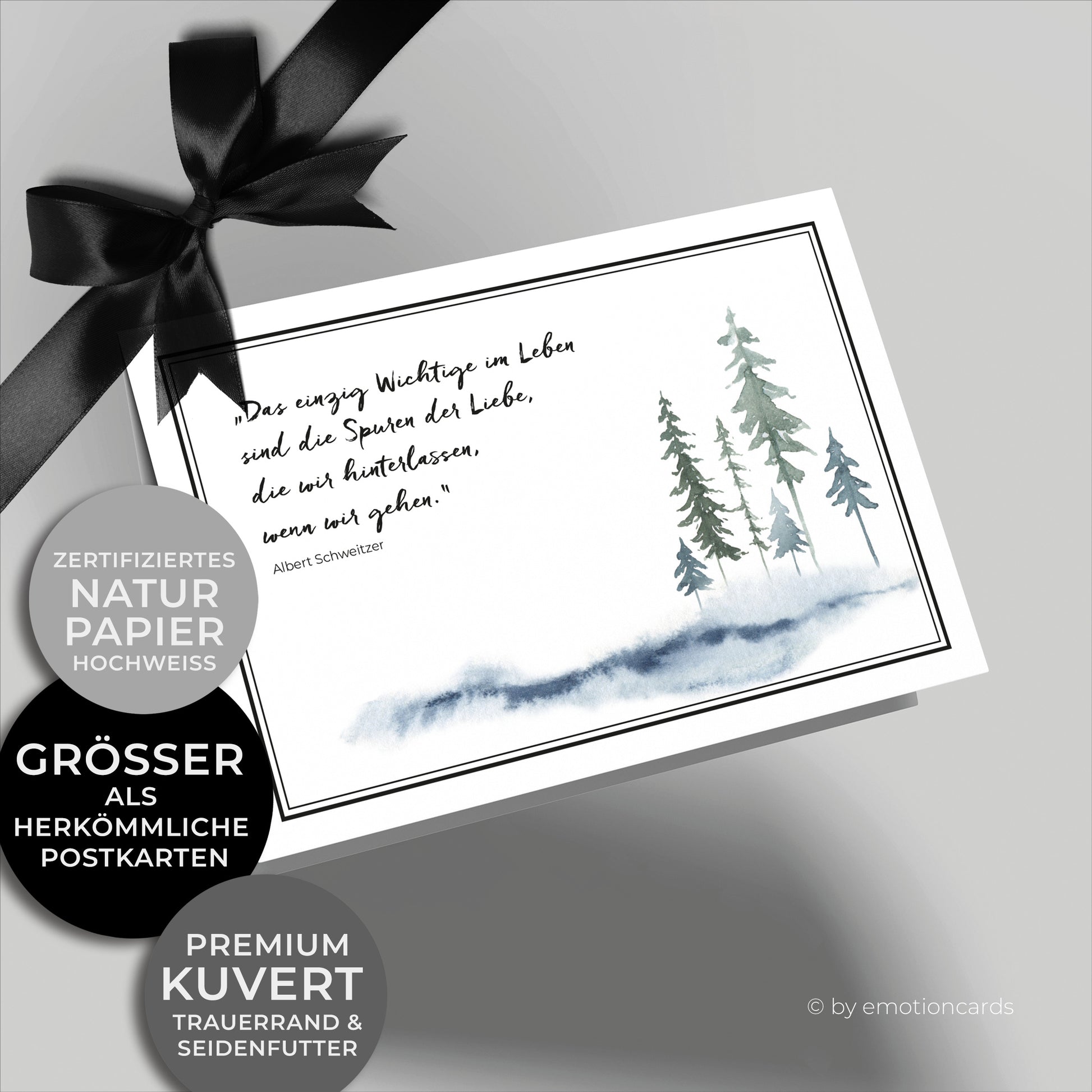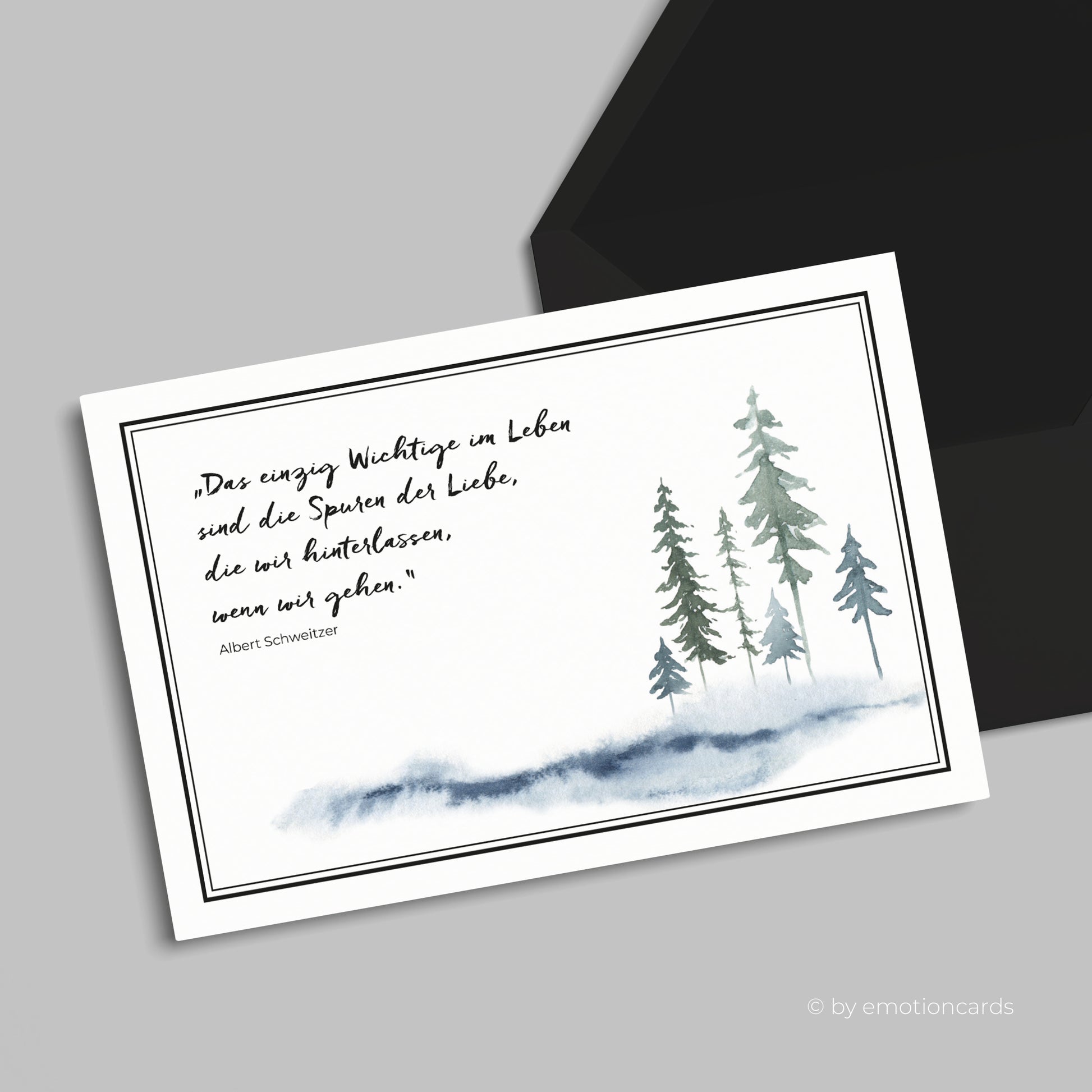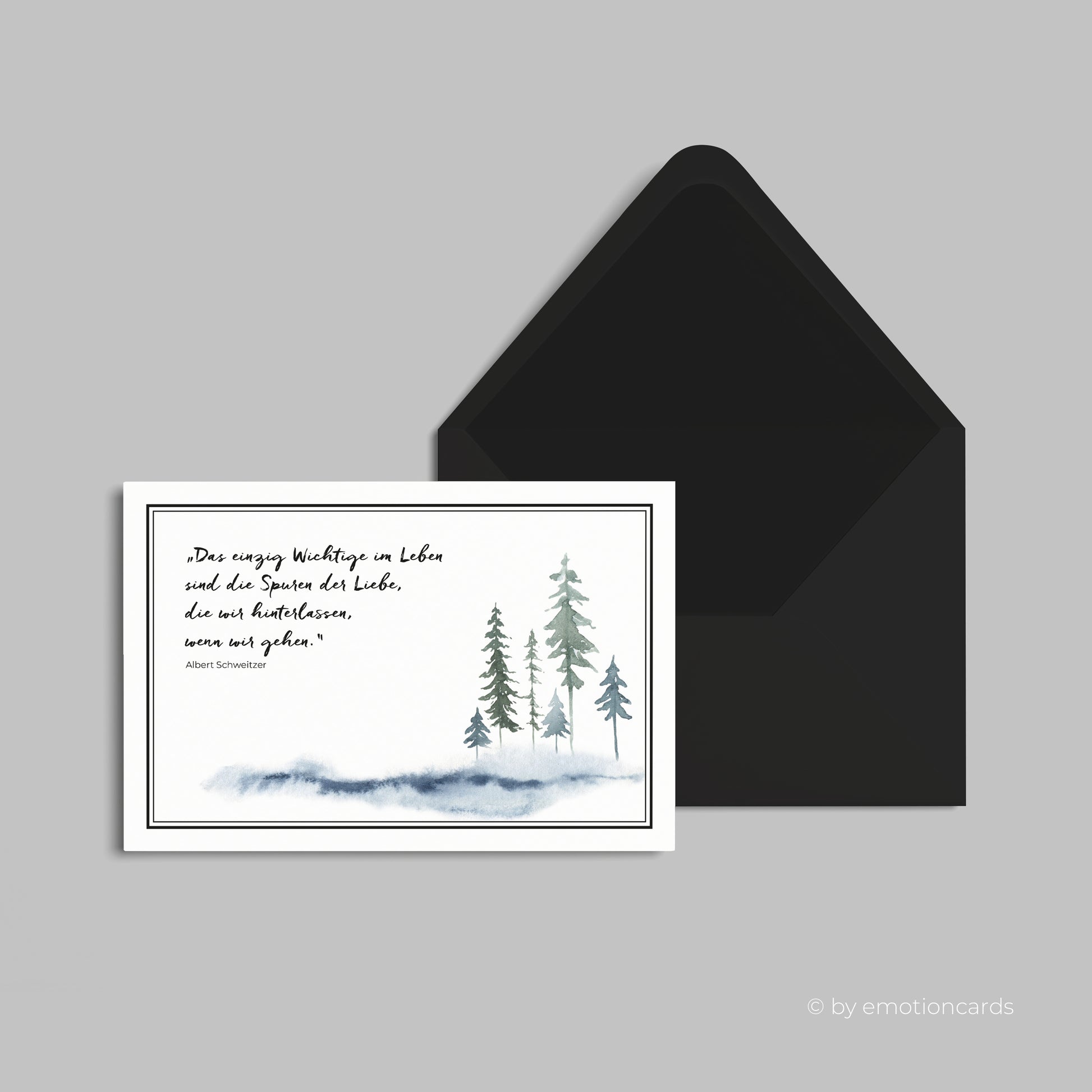 Diese elegante Trauerkarte mit einem bekannten Zitat von Albert Schweitzer ist eine würdevolle und einfühlsame Art, dein Mitgefühl auszudrücken. Der zarte Aquarellstil mit fein gezeichneten Tannen symbolisiert Stärke, Trost und das Weiterleben in Zeiten des Abschieds. Der feine Rahmen verleiht der Karte eine schlichte, aber edle Anmutung.