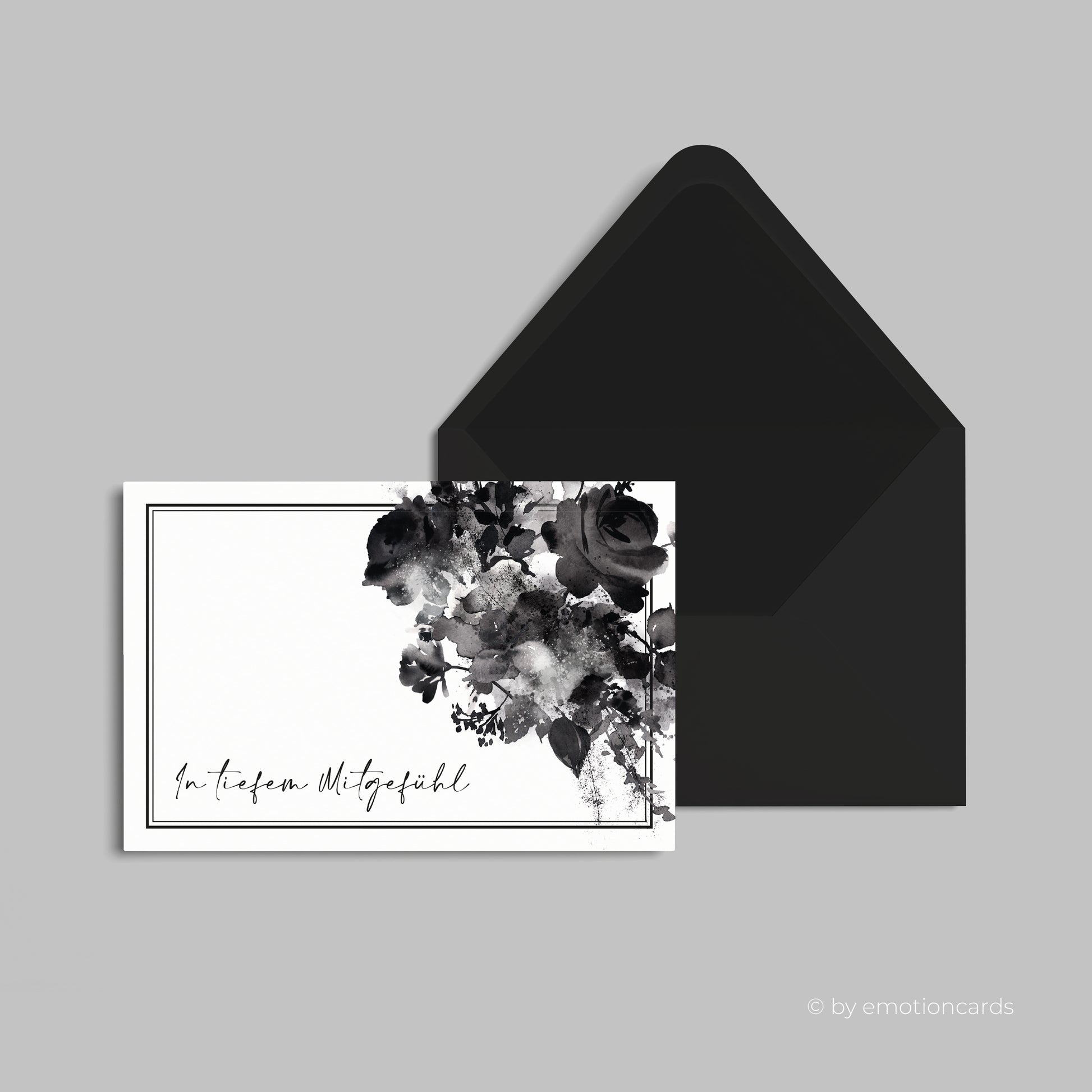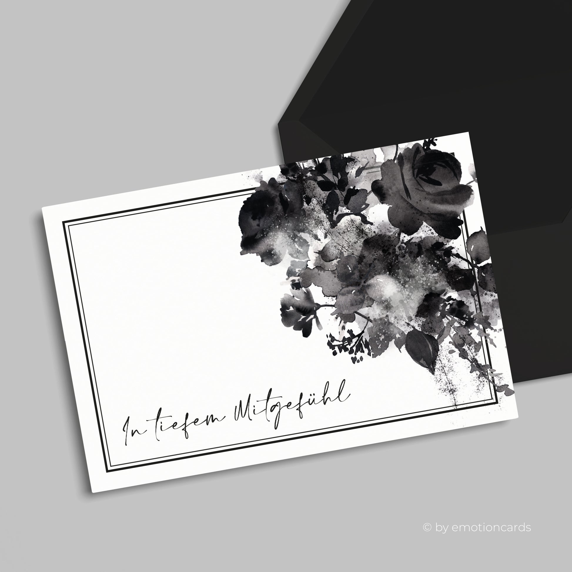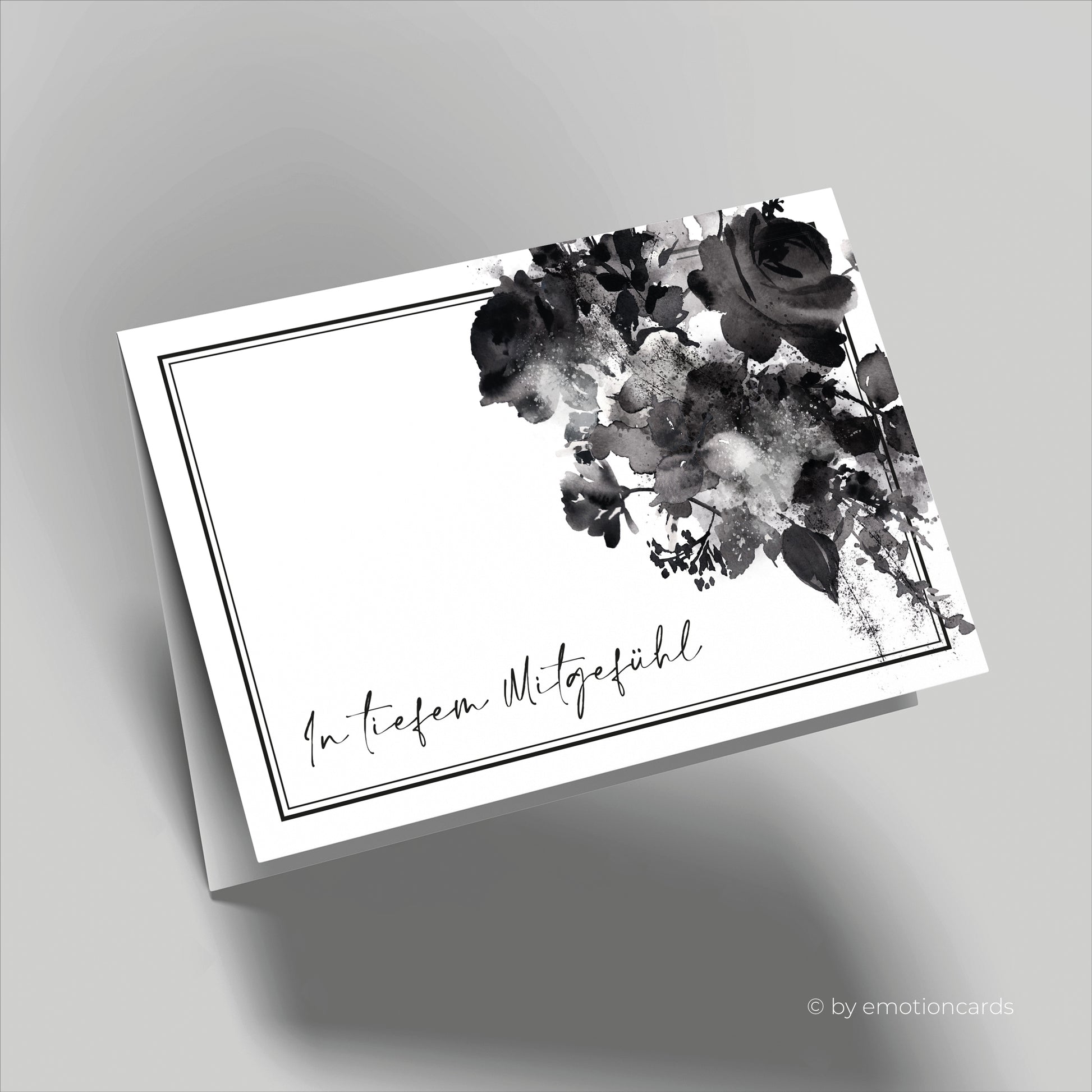 Diese elegante Trauerkarte mit schönen Aquarellrosen und dem Satz: In tiefem Mitgefühl ist eine einfühlsame Art, dein Beileid auszudrücken. Mit stilvollen Rahmen und auf hochwertigem Premium-Karton gedruckt, ist sie eine besondere und persönliche Geste. Inklusive Umschlag und in einer Größe von 170mm x 115mm erhältlich.